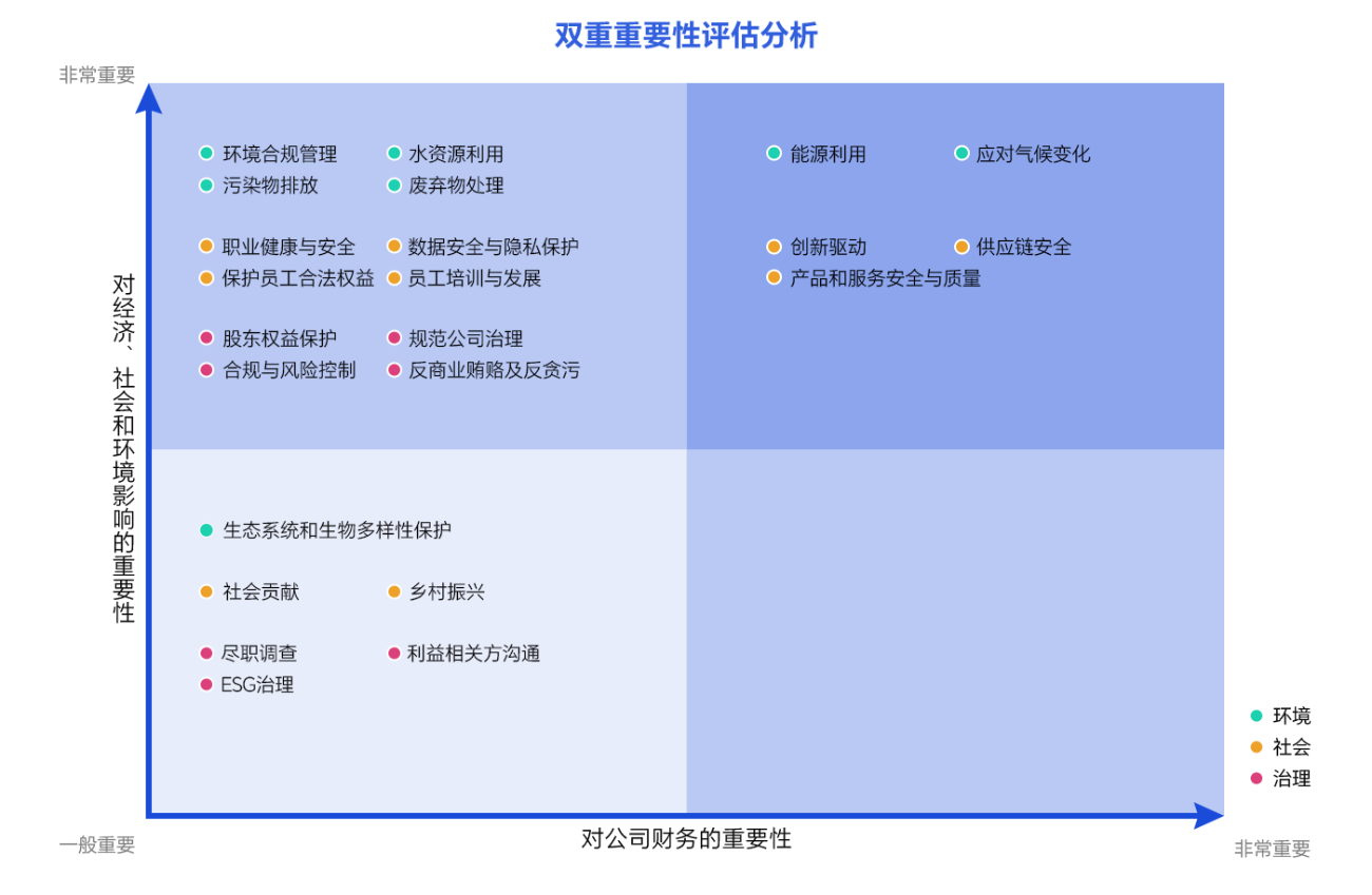 我們定期根據(jù)行業(yè)對標分析結(jié)果,結(jié)合利益相關(guān)方回收的問卷,從“影響重要性”與“財務重要性”兩個維度進行識別,形成重要性議題矩陣。